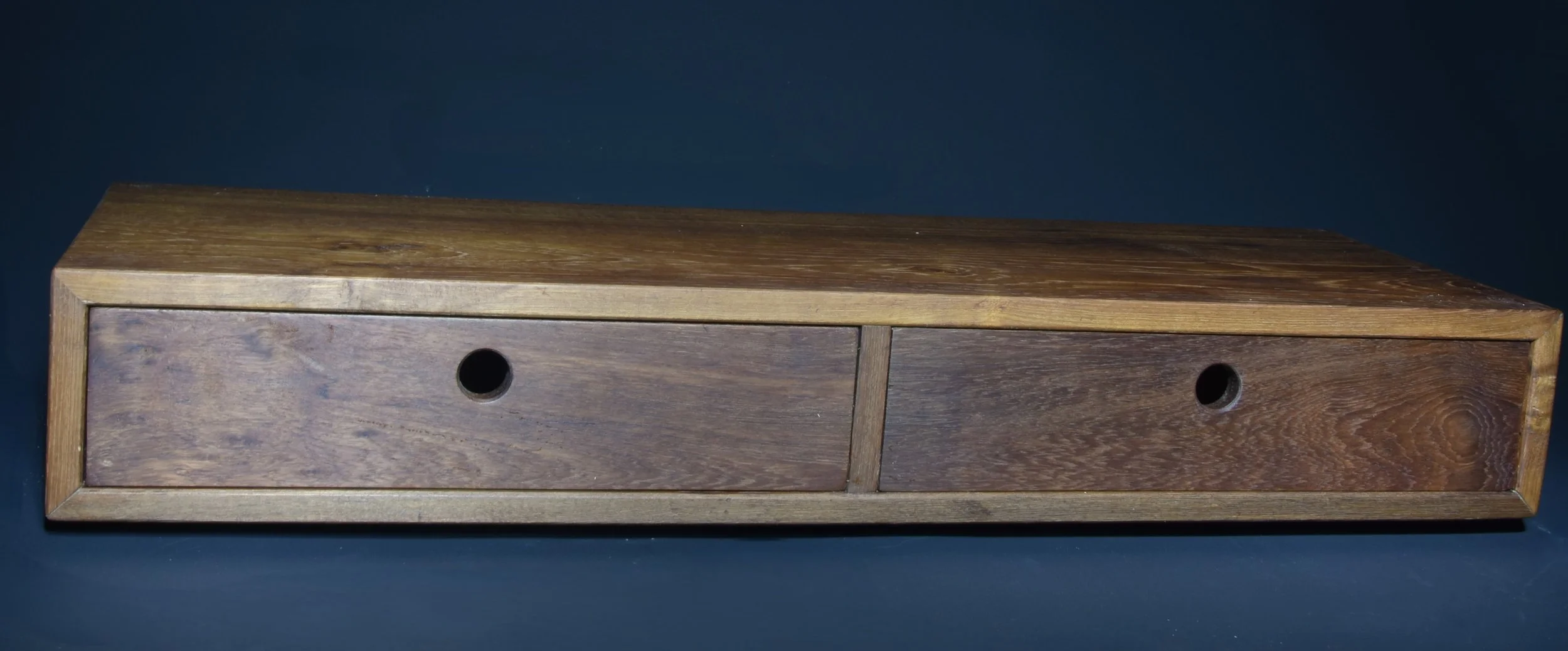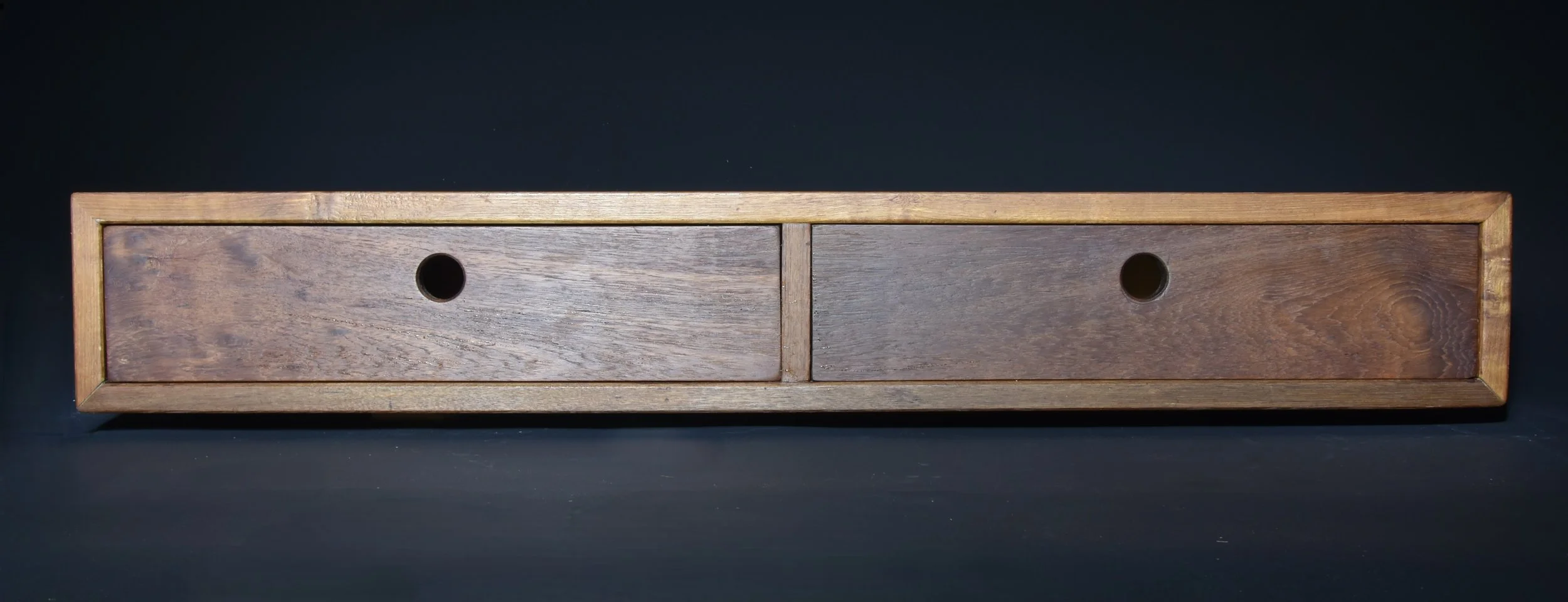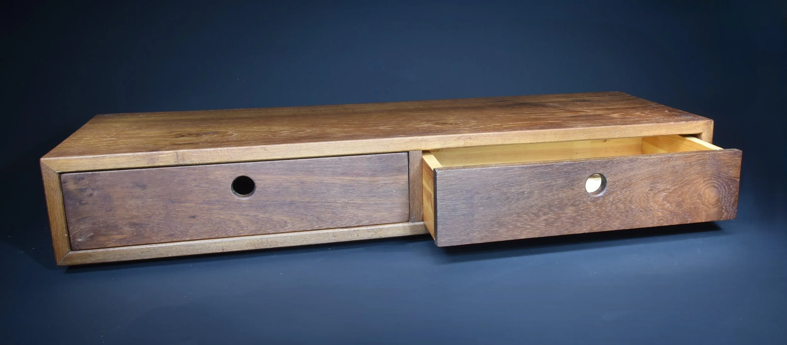 Deze op maat gemaakte zwevende kast is ontworpen als eenvoudige en elegante plek voor een koffieapparaat, met lades voor praktische opbergruimte. Het donkere mahoniehout, afkomstig van een voormalige tafel van meer dan 40 jaar oud, had flink wat beschadigingen en reparaties nodig om het weer bruikbaar te maken.