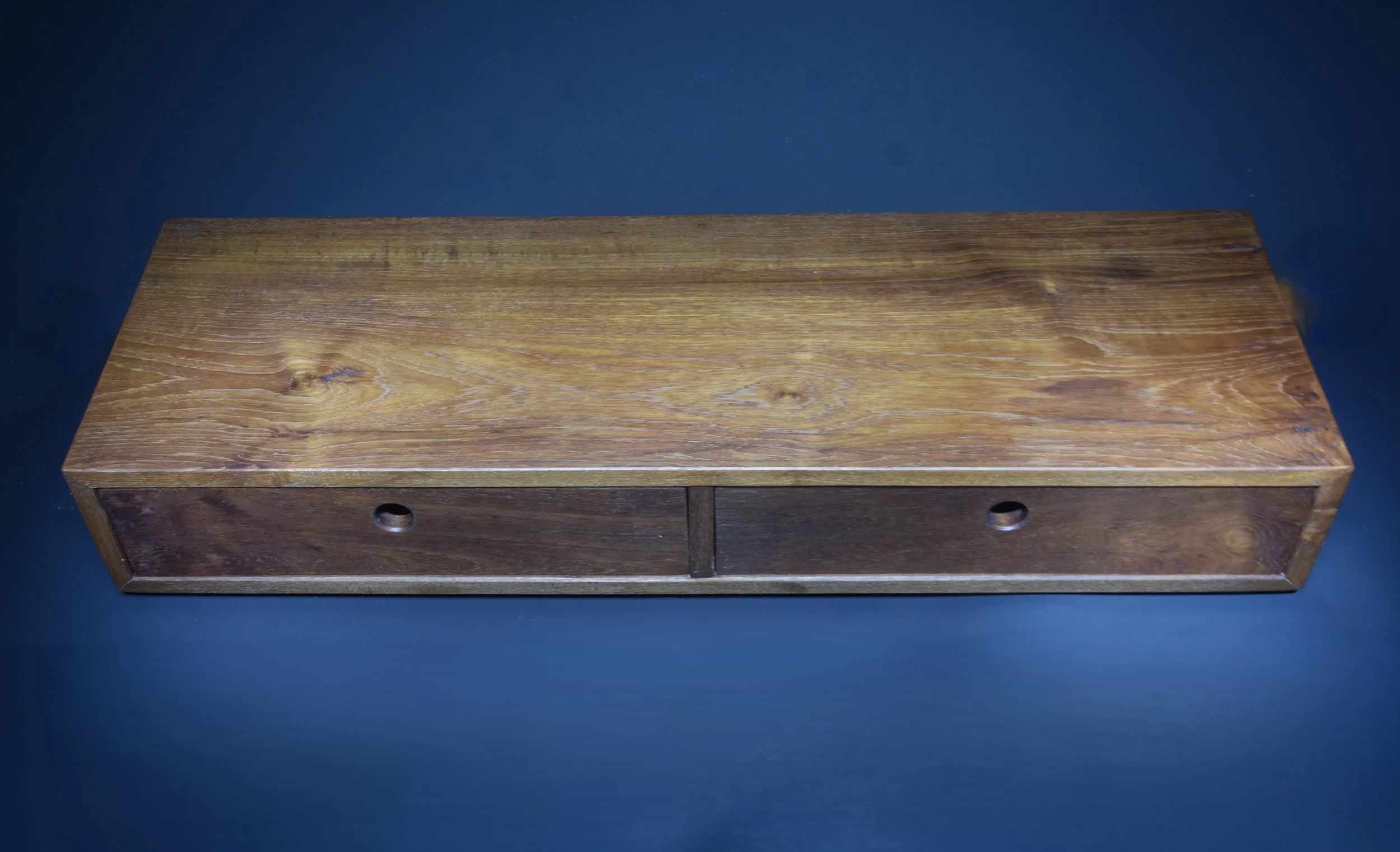 Grote beschadigingen zijn met inlegwerk gerepareerd, en na zorgvuldig schaven zag het hout er weer als nieuw uit. Voor de constructie is gekozen voor verstekverbindingen, zodat de houtnerf prachtig doorloopt van de bovenkant naar de zijkanten. Het strakke, minimalistische ontwerp en de warme tint van het hout maken deze kast een echte blikvanger met karakter.